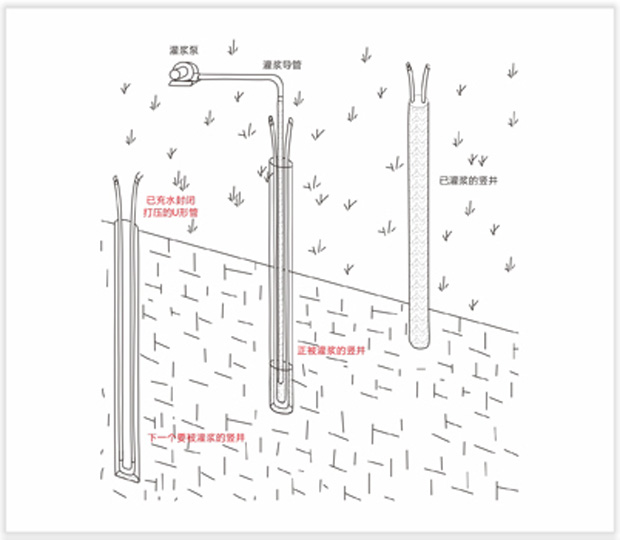灌漿封井也稱為回填工序。在回填之前應對埋管進行試壓,確認無泄漏現象后方可進行回填。正確的回填要達到兩個目的:一是要強化埋管與鉆孔壁之間的傳熱,二是要實現密封的作用,避免地下含水層受到地表水等可能的污染。為了使熱交換器具有更好的傳熱性能,一般選用特殊材料制成的專用灌注材料進行回填,鉆孔過程中產生的泥漿沉淀物也是一種可選擇的回填材料?;靥钗镏胁坏糜写罅降念w粒,回填時必須根據灌漿速度的快慢將灌漿管逐步抽出,使混合漿自上而下回灌封井確保回灌密實,無空腔,減少傳熱熱阻。當上返泥漿密度與灌注材料密度相等時,回填過程結束。系統安裝完畢后,應進行清洗、排污,按要求對管道進行沖洗和試壓,確認管內無雜質后,方可灌水。